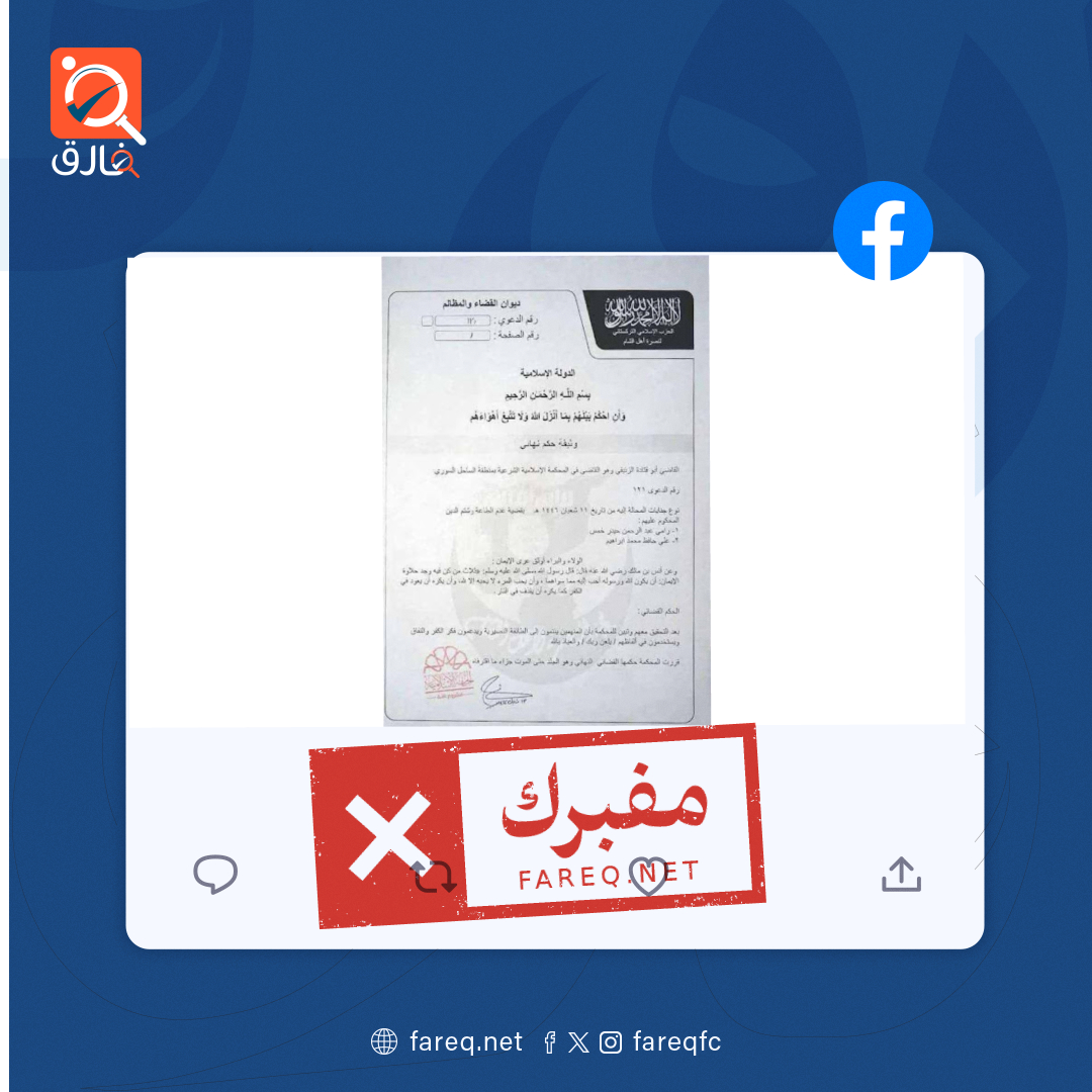 الوثيقة المتداولة عن الحزب التركستاني الإسلامي وتتضمن حكم بإعدام شخصين من الطائفة العلوية مضللة