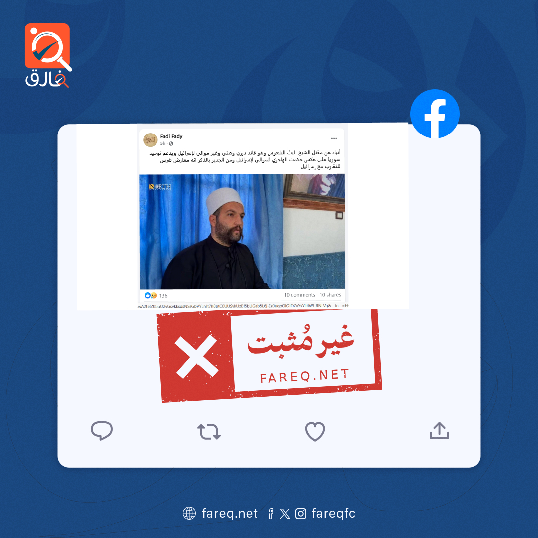 لاتوجد أي مصادر تدعم الادعاء بأنه تم اعتقال الشيخ ليث البلعوس قائد حركة رجال الكرامة الدرزية في السويداء.