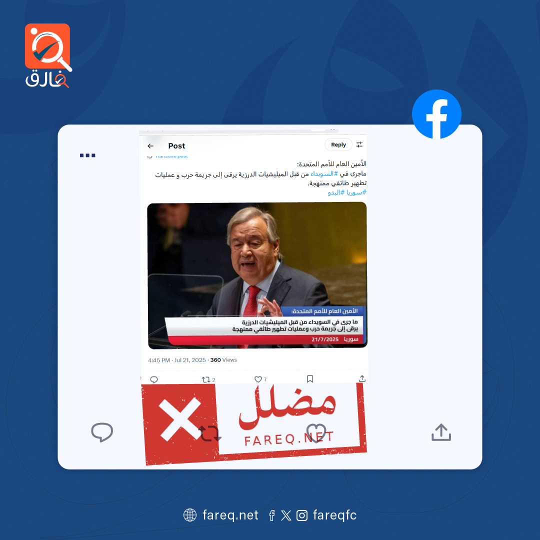 قام فريق تدقيق المعلومات بمنصة فارق بالتأكد من حقيقة تصريحات الأمين العام للأمم المتحدة أنطونيو غوتيريش التي زعمت حسابات على مواقع التواصل أنه قال فيها "أن ما جرى في السويداء من قبل الميليشيات الدرزية يرقى إلى جريمة حرب وعمليات تطهير طائفي ممنهجة"، وتم إجراء بحث في موقع الأمم المتحدة الرسمي، وفي وكالات الأنباء والمواقع الإخبارية، وتبين أنه التصريح مضلل.