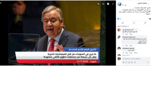 تداولت صفحات على مواقع التواصل الاجتماعي من بينها قحطان الشرقي وغسان ياسين على فيسبوك وحسام الجمّال وFadel Moghrabi على اكس، ادعاءات بأن الأمين العام للأمم المتحدة أنطونيو غوتيريش أدلى بتصريحات قال “أن ما جرى في السويداء من قبل الميليشيات الدرزية يرقى إلى جريمة حرب وعمليات تطهير طائفي ممنهجة”.